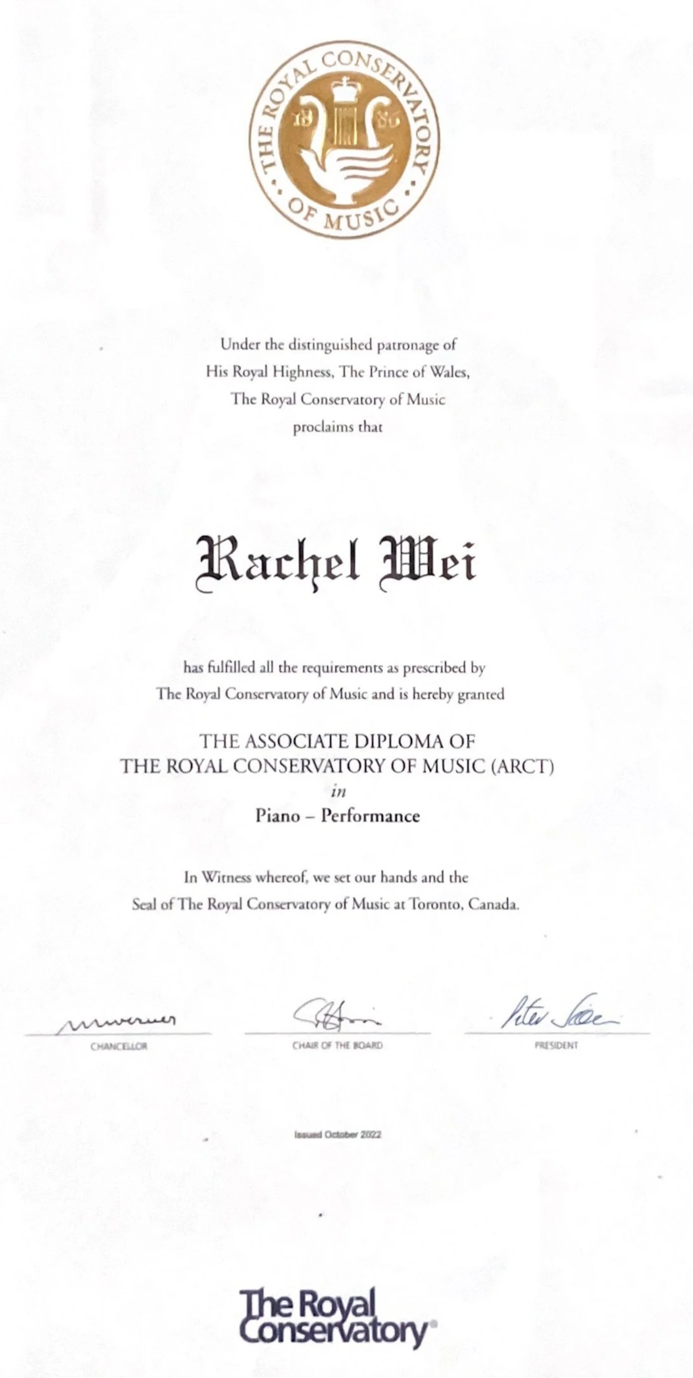 The Associate Diploma of the Royal Conservatory of Music (ARCT) in Piano Performance - SEPTEMBER 2021