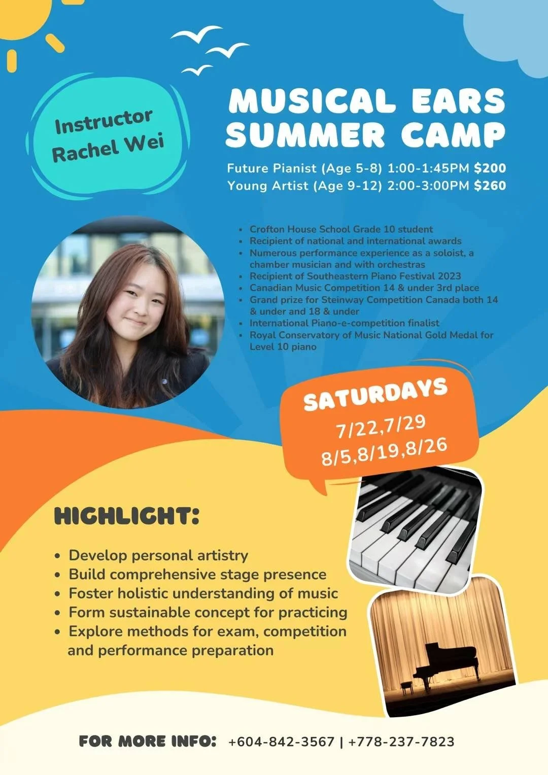 In the summer of 2023, Rachel held her Musical Ears Summer Camp. She taught students from ages 9-12 and developed a curriculum tailored specifically to her students. Every week, her students were taught about one of the classical music eras and brought pieces to perform for the class and have lessons on. The final week ended with a celebration of music, performances from each student, and some fun games.